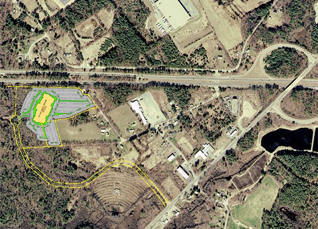 Concept plan of twin 500,000 s.f. warehouse and distribution facility overlaid on aerial photograph.